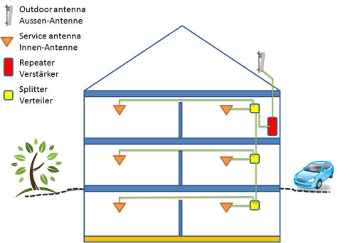 In den meisten Fällen werden die Antennen einer Mobilfunk-Indoorversorgung über einen Mobilfunkrepeater (Mobilfunkverstärker) gespeist. Dieser Repeater empfängt das Mobilfunksignal über eine Außenantenne, verstärkt das Signal und sendet es über die Indoorantennen im Gebäude.